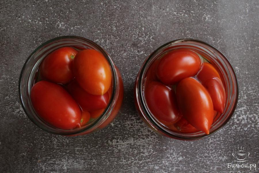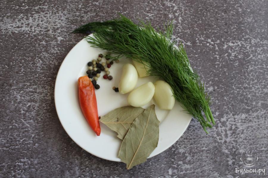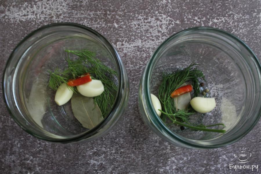3. В две литровые баночки поровну разложить чеснок, лавровый лист, перец горошек, укроп, по кусочку перца чили.