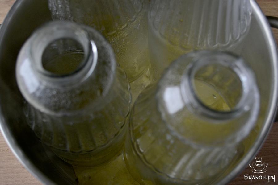 3. Пока сок варится, промойте банки/бутылки. Стерилизуйте удобным способом: в духовке, микроволновке или, как в рецепте, на водяной бане в кастрюле.