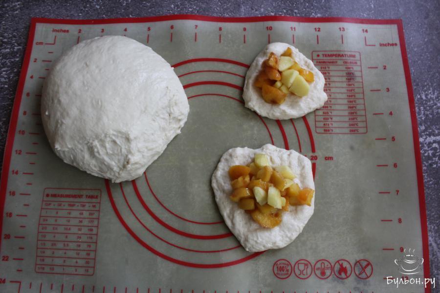 7. Тесто разделить на одинаковые кусочки. Каждый кусочек теста руками размять в лепешечку толщиной около 0.5 см. На лепешечку разложить по 2-3 ч. л. начинки. Края теста защипнуть и сформировать пирожки.