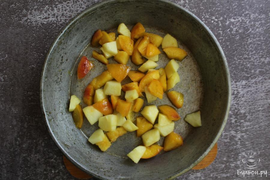 5. Для начинки: яблоки и нектарины промыть, убрать семечки и косточки. Нарезать фрукты небольшими кубиками и обжарить их минут 10-15 на сухой сковороде, на небольшом огне, до мягкости. Если фрукты не сильно сладкие, то добавьте сахар по вкусу в готовую начинку.