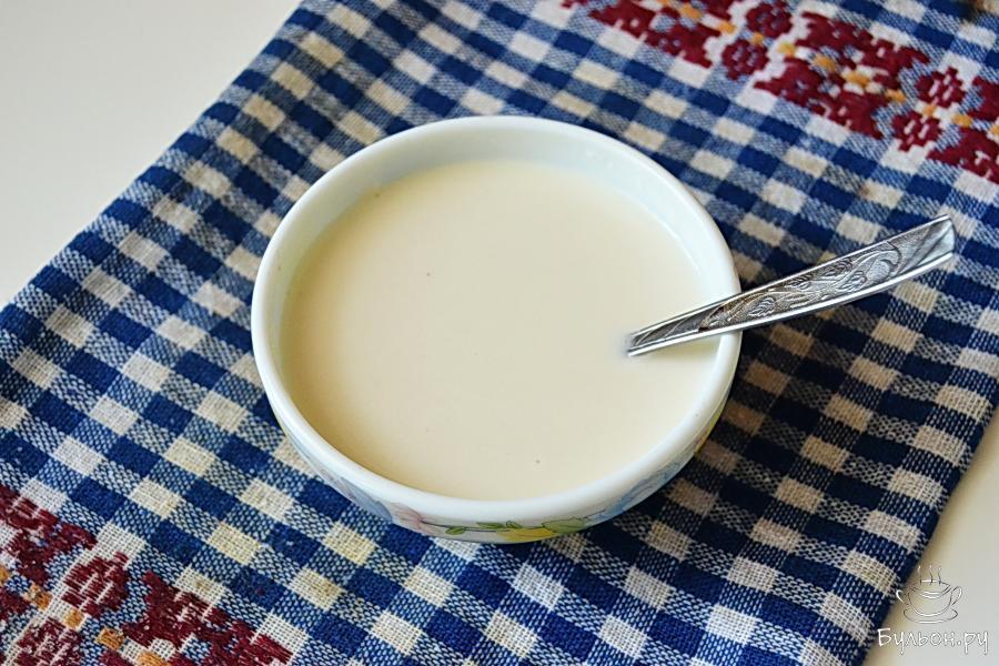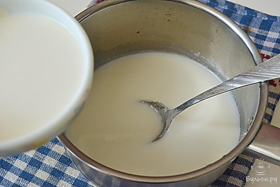 4. Влить разведенную муку в молоко тонкой струйкой, одновременно перемешивая. Проварить при постоянном помешивании минуты 2 Масса на глазах начнет загустевать.