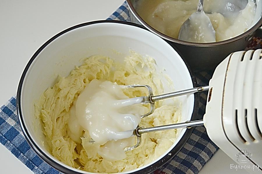 7. Влить часть массы - взбить миксером. Влить еще немного массы - и снова взбить. Так вливаем, пока не вольем всю массу или же крем не достигнет нужной нам степени густоты. Вся масса нам может и не понадобиться.