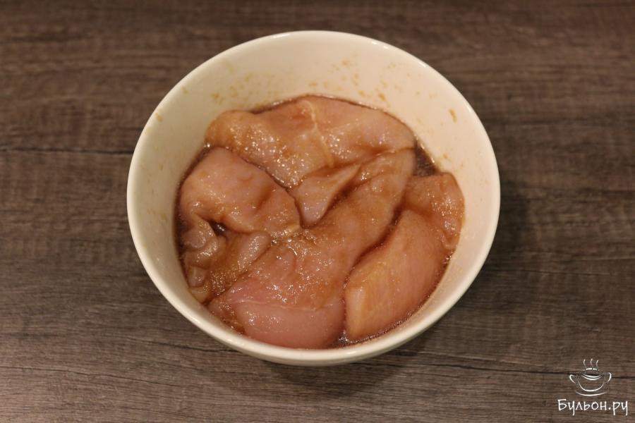3. Нарезанное филе положите в миску с маринадом, перемешайте. Оставьте мариноваться на 20 минут. Соль добавьте чуть-чуть, так как соевый соус итак достаточно соленый.