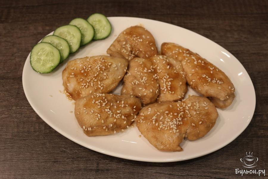 5. Жарьте филе еще 5 минут, на небольшом огне под крышкой. Готовые кусочки выложите на блюдо, полейте их оставшимся на сковороде соусом. Затем курицу посыпьте кунжутом. По желанию можете украсить блюдо зеленью.
