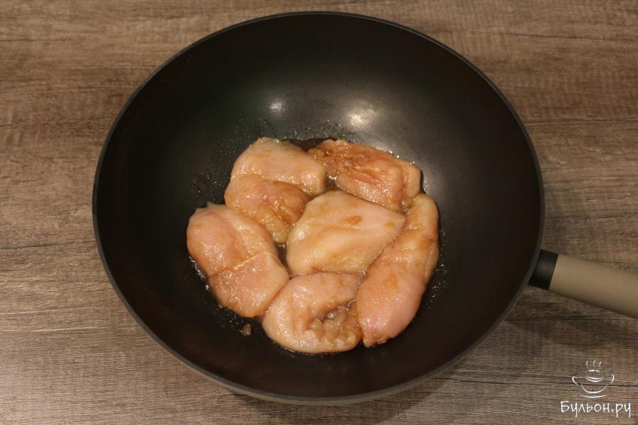4. Сковороду поставьте на средний огонь, прогрейте ее ничем на смазывая, так как в маринаде уже есть растительное масло. Куриного филе выложите вместе с соусом, жарьте 5 минут с одной стороны. Затем переверните филе на другую сторону.