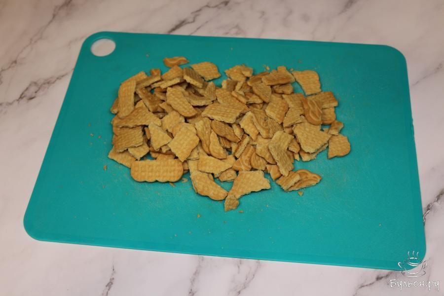 2. Печенье поломайте на кусочки среднего размера. Промелите его через мясорубку, измельчив его таким образом в крошку.