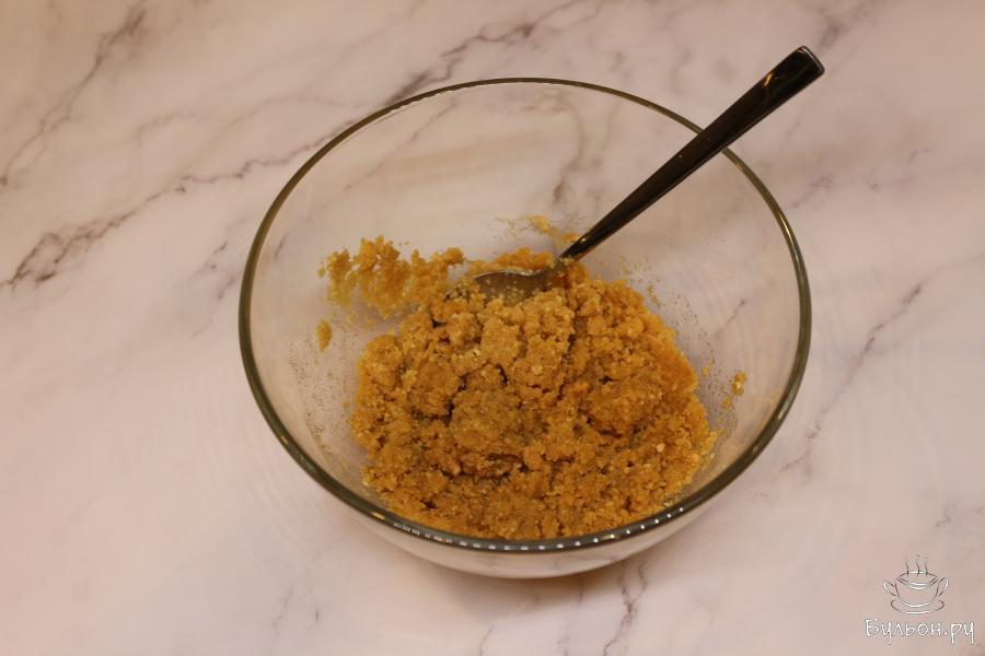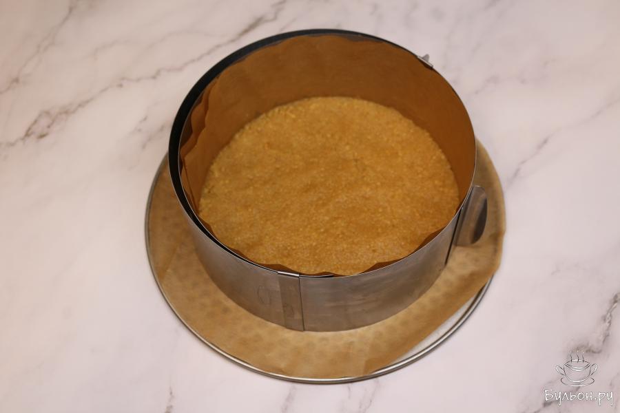 4. Дно формы застелите пергаментом, установите кондитерское кольцо или используйте форму с дном. Массу из печенья и масла выложите на дно, разровняйте и хорошо утрамбуйте.