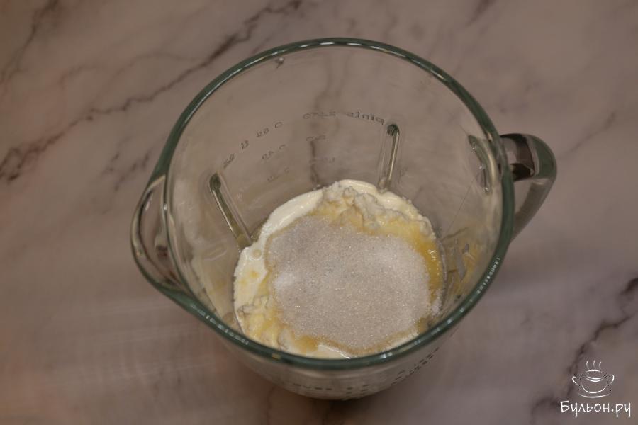 5. Рикотту немного отожмите, удалив таким образом лишнюю жидкость. В чашу блендера выложите рикотту, сахарный песок, добавьте сливки. Взбейте все до однородности.