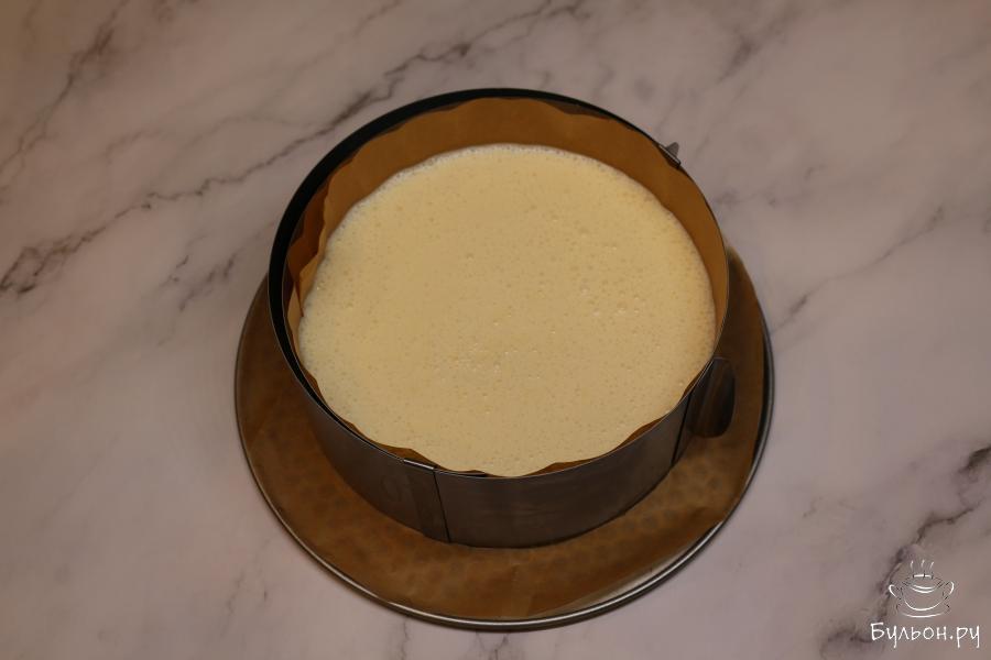 7. Вылейте получившуюся массу на основу чизкейка. Выпекайте чизкейк в разогретой до 200 градусов духовке, в течение 15 минут. После уменьшите температуру до 110 градусов. Пеките еще 50-70 минут. У готового чизкейка должны схватиться края, а серединка чуть подрагивать.