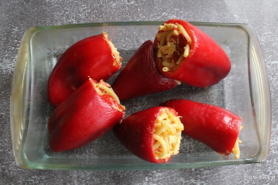 7. Наполнить перцы начинкой. Выложить перцы в форму для запекания. Духовку разогреть до 180 градусов. Готовить блюдо 35-40 минут.