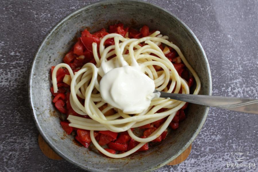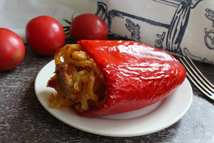 Если вам не хочется делать мясные фаршированные перцы, обратите внимание на этот рецепт. Сладкие перцы, фаршированные мыром и спагетти - это блюдо необычное и очень вкусное. Перцы получаются сытные, вкусные, нежные и сочные. Готовится блюдо просто. Количество ингредиентов можно изменить, добавить больше или меньше сыра и сливок. Пробуйте начинку и регулируйте по своему вкусу. По желанию, в начинку можно добавить измельченную зелень, любимые пряности.