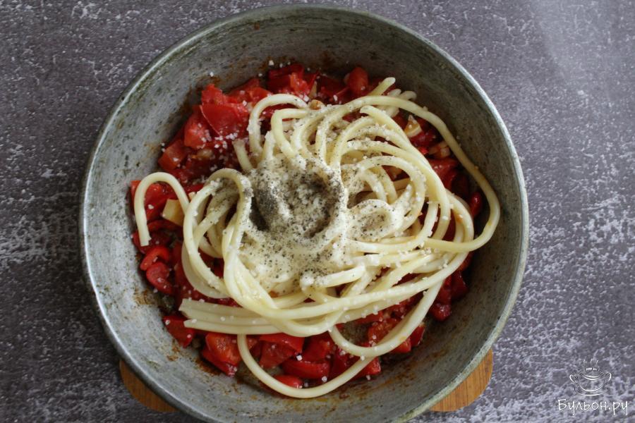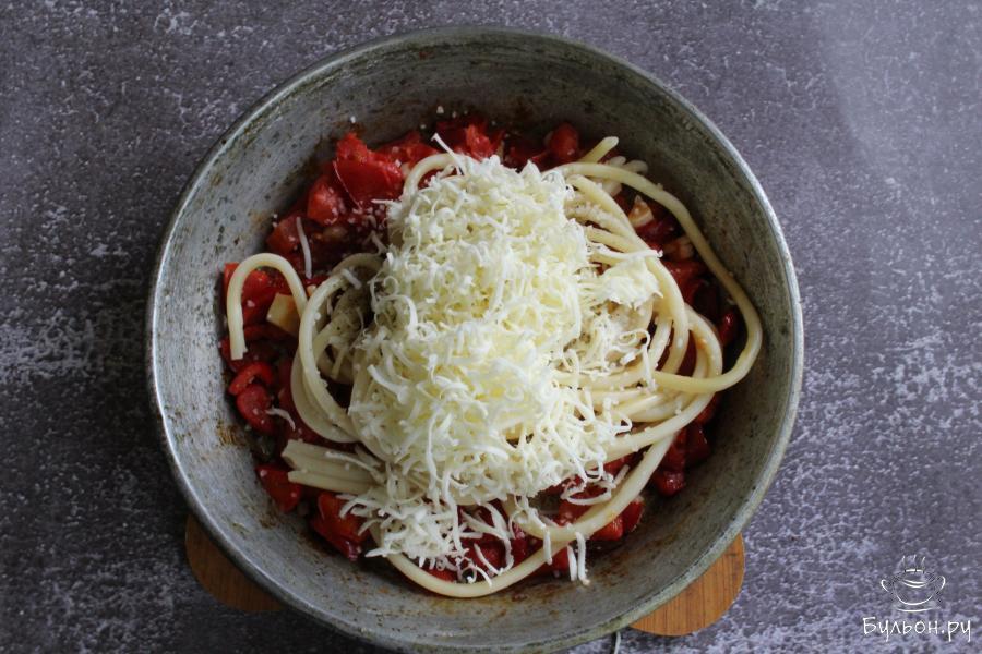 6. Добавить на сковороду тертый сыр и перемешать. По желанию половину сыра можно оставить и присыпать им начинку сверху в перцах, чтобы была видна сырная шапочка.