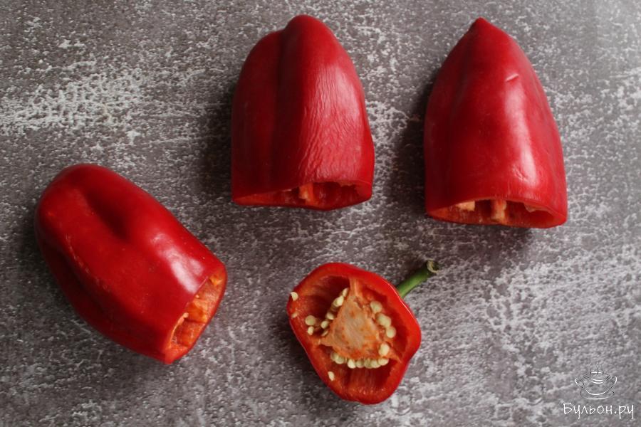1. У крупных перцев срезать плодоножки с небольшим количеством мякоти, "хвостики" не выкидывать. Перцы почистить от семян и промыть.