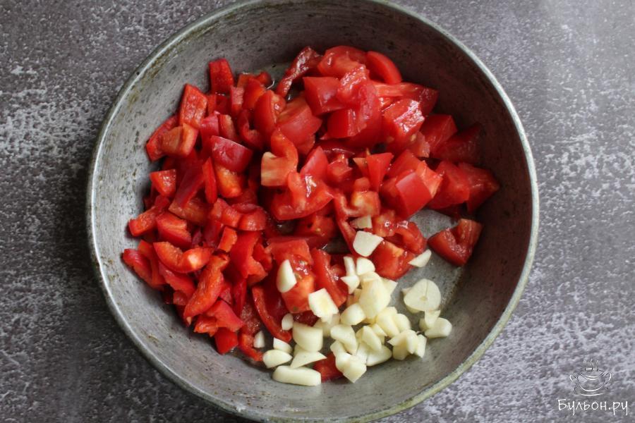2. Мякоть перцев снять с плодоножек и мелко нарезать. Помидор и чеснок тоже мелко нарезать. Выложить все на сковороду с разогретым маслом. Тушить несколько минут, до мягкости перцев. Убрать сковороду с огня.