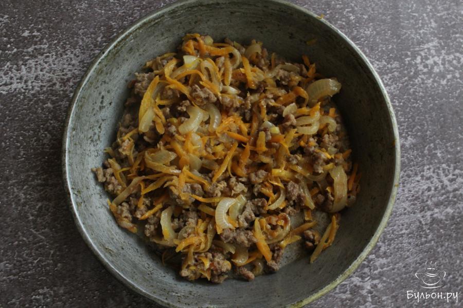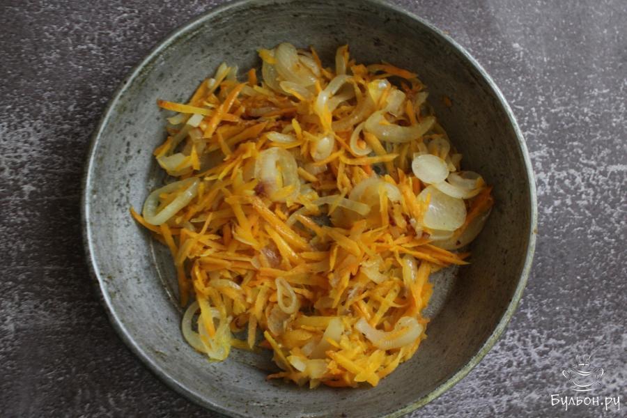 6. Морковь почистить, промыть и перетереть на крупной терке. Добавить морковь к луку и обжарить все вместе 3-4 минуты.