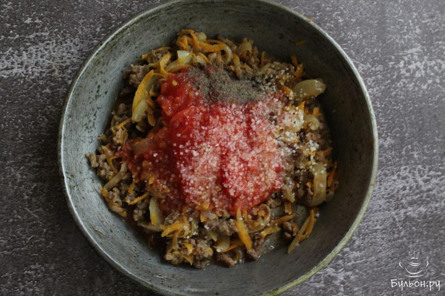 8. Помидор перетереть через терку, добавить томатную массу на сковороду. Посолить и поперчить начинку. Тушить начинку 10 минут. Помешивать.