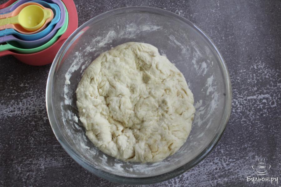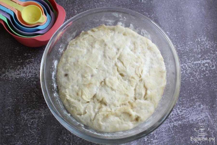 4. Добавить в чашку 2 стакана муки, замесить тесто. Если тесто липнет, добавить немного муки. Убрать чашку с тестом в теплое место на час.