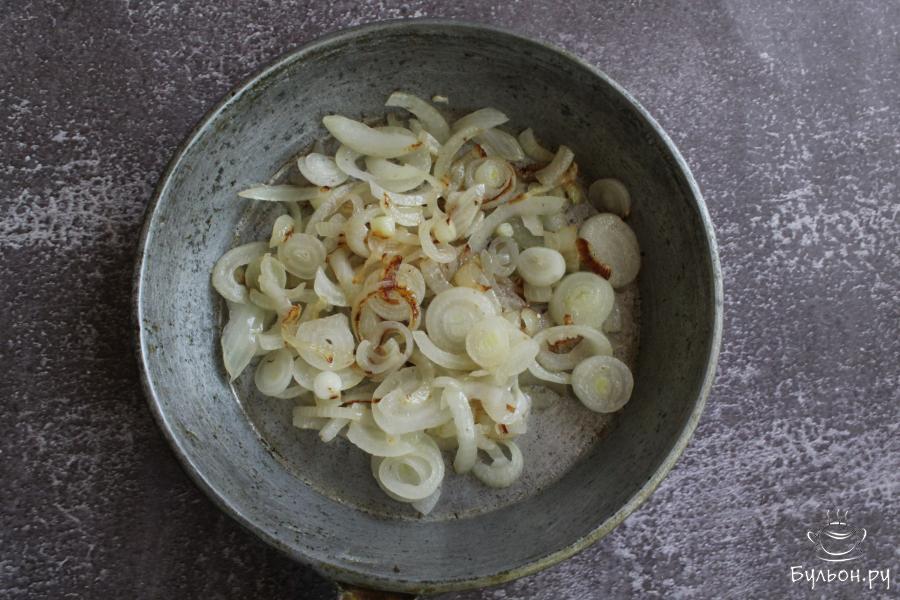 5. Лук почистить, промыть и мелко нарезать. На сковороду влить 2 ч. л. масла, прогреть и обжарить лук до мягкости.