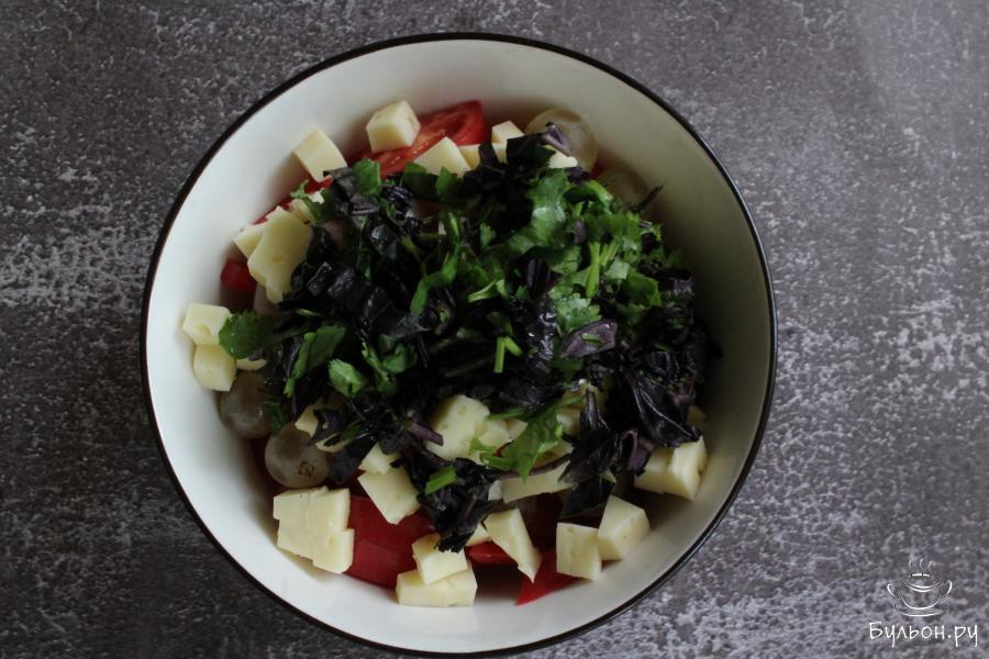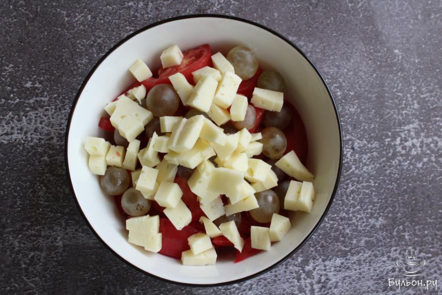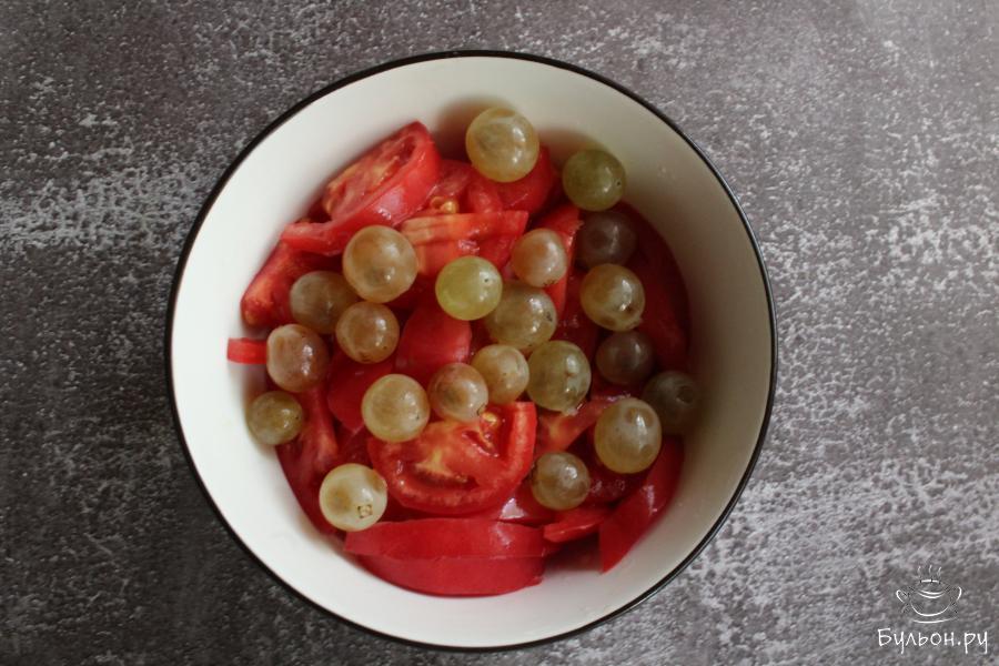 Любителям низкокаллорийных, легких салатов предлагаю обратить внимание на этот рецепт. Если у вас под рукой есть сладкие помидоры и виноград без косточек, то всегда можно приготовить такой салат. Салат получается сочный, вкусный, очень ароматный и полезный. Благодаря добавлению винограда салат получается с легкой сладкой ноткой. Поэтому такой салат отлично подойдет, больше, для посиделок с подружками, чем для мужской компании. Этот салат нельзя хранить, потому что сыр потеряет вкус, салат сразу нужно подать к столу.