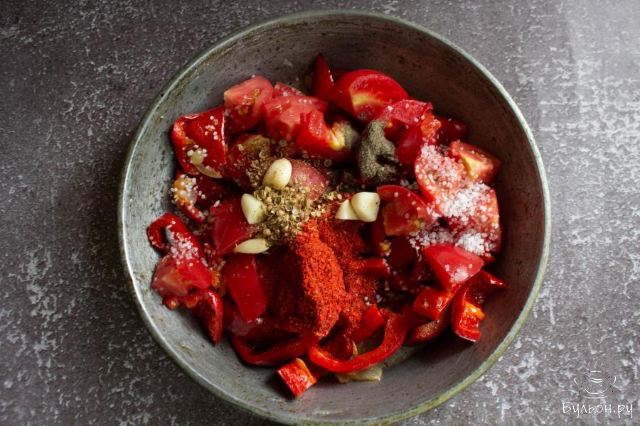 5. Добавить на сковороду сахар, соль, сладкую паприку, черный перец и кориандр. Готовить соус 20-25 минут. Помешивать