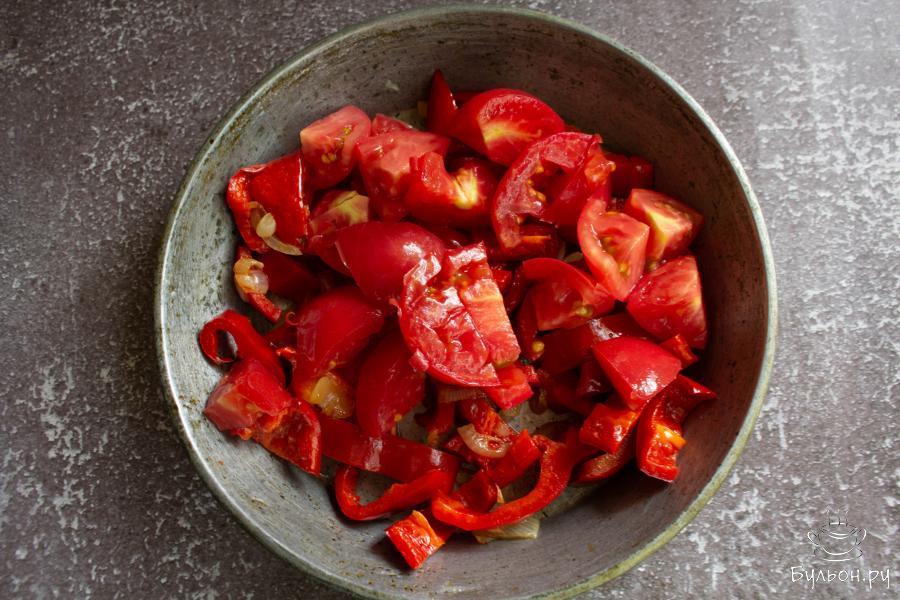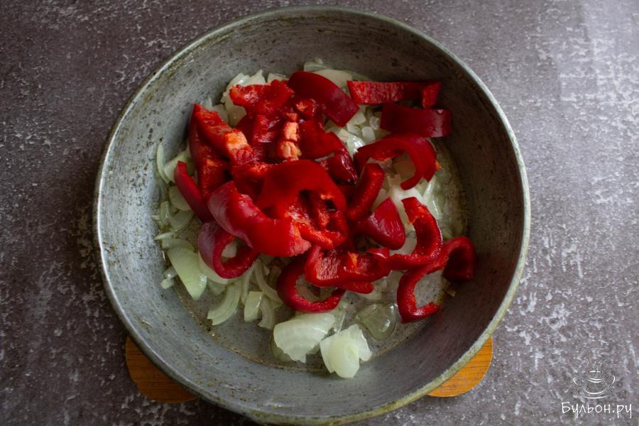 2. Сладкие красные перцы почистить от семечек, промыть, нарезать полосками. Добавить перцы на сковороду и обжарить все вместе 3-4 минуты.