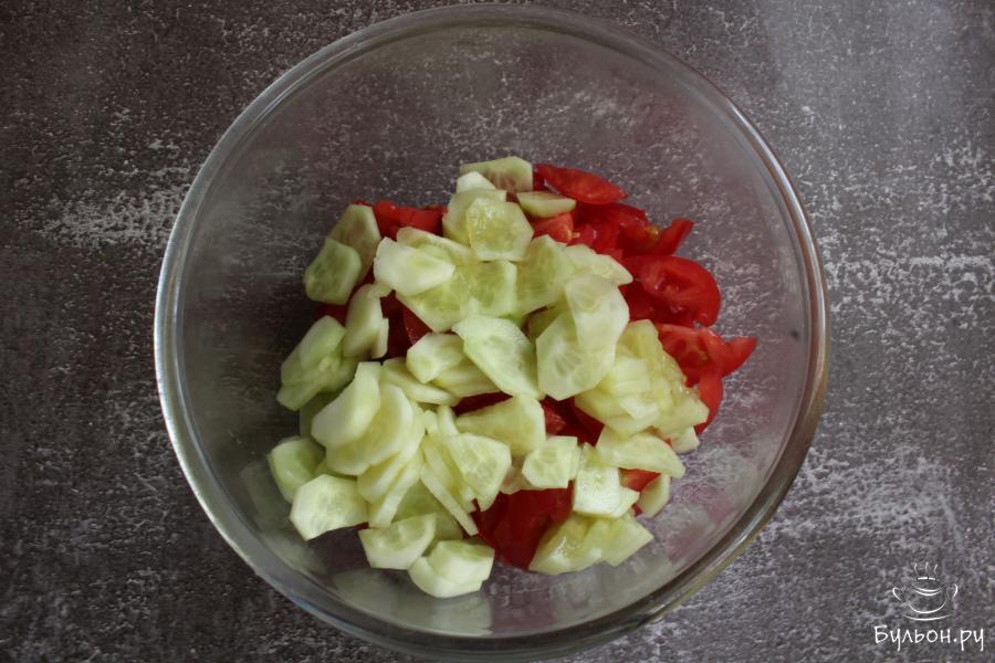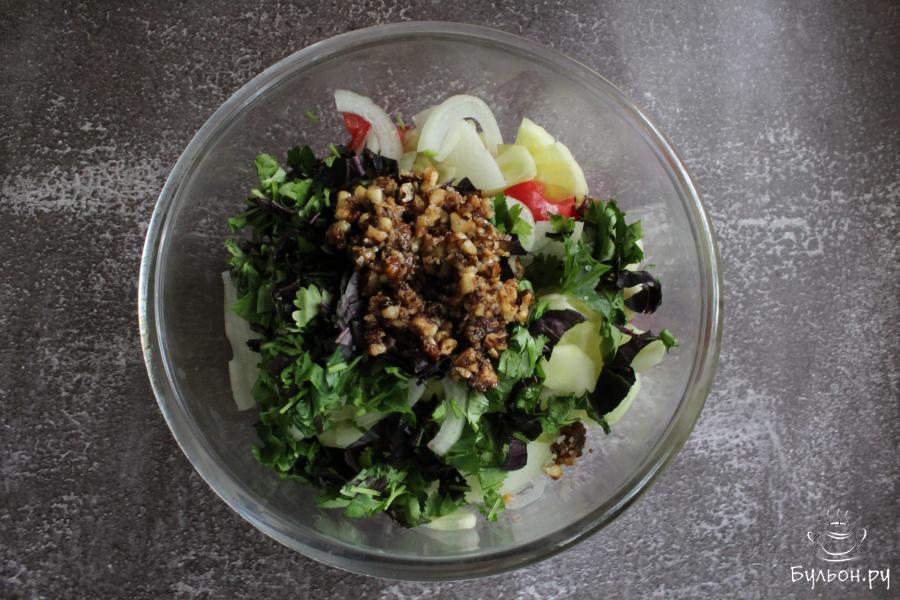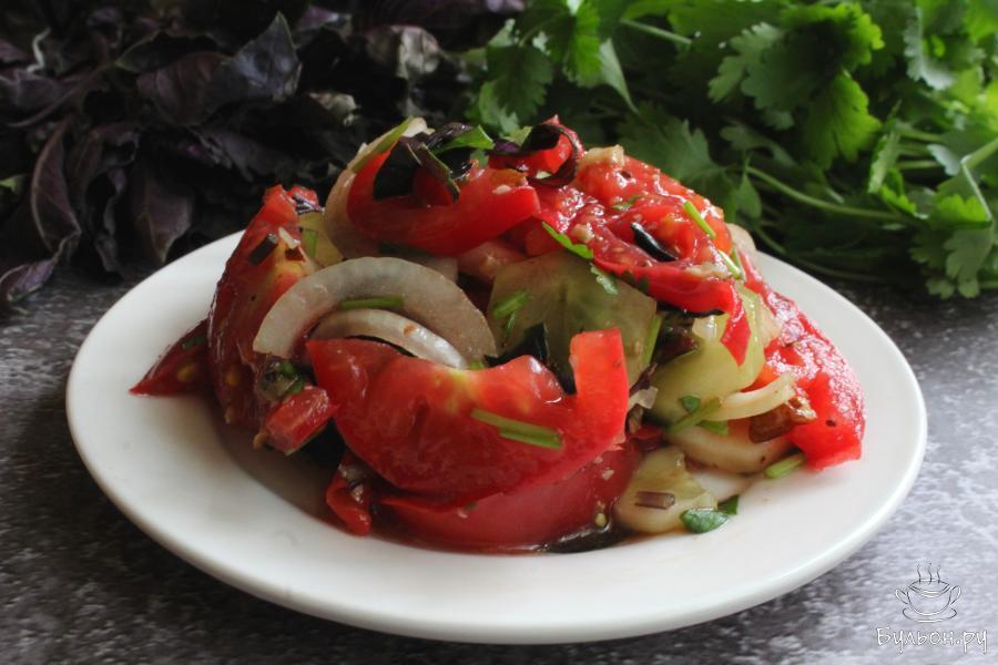 Салат из помидоров, огурцов и лука с ореховой заправкой получается невероятно душистый, пикантный, сочный и легкий. Этот салат готовится из свежих овощей, без майонеза, без обжарки ингредиентов, поэтому салат не только вкусный, но и полезный. Этот пикантный салат понравится многим. Готовится салат очень быстро, что тоже не может не порадовать. Если вы любите овощные салаты, попробуйте приготовить и такой, вкус вас не разочарует! Орехи для приготовления можно порубить, а можно измельчить очень сильно, это на ваш вкус.