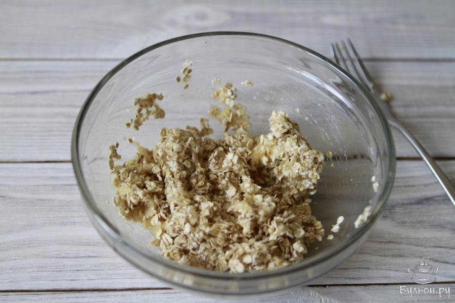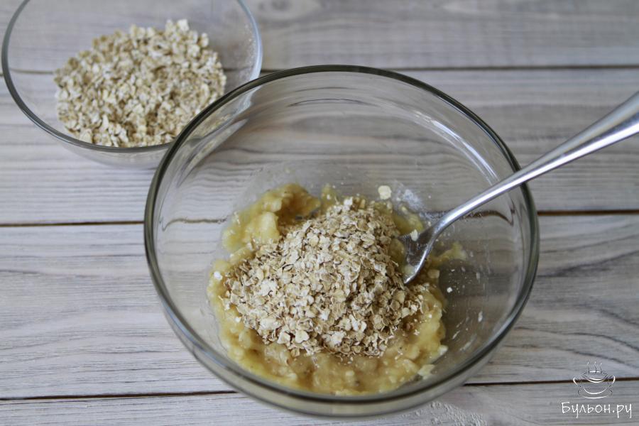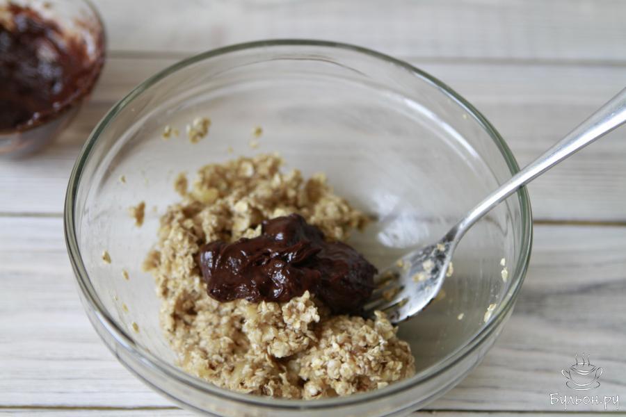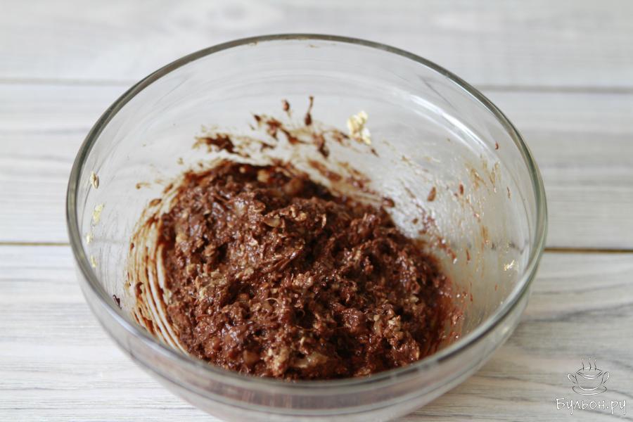4. Растопить шоколад на водяной бане или в микроволновой печи. Добавить ванилин и шоколадную массу к бананово-овсяной смеси.
