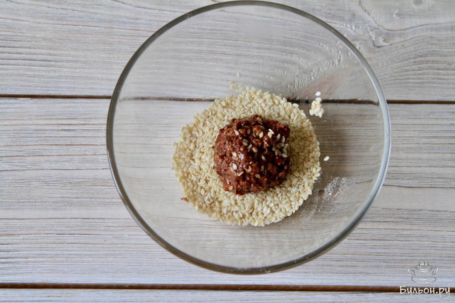 6. Разделить смесь на равное количество и скатать шарики диаметром с грецкий орех. Каждый шарик обвалять в семенах кунжута.