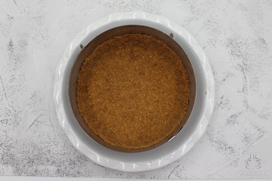 1. Измельчите печенье в крошку и смешайте с растопленным сливочным маслом. Используйте форму диаметром 20 см. Масляную крошку выложите в форму и сформируйте основу для торта с бортиками, высотой 3,5 см.