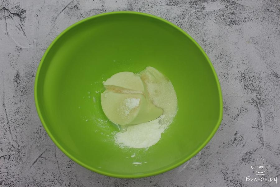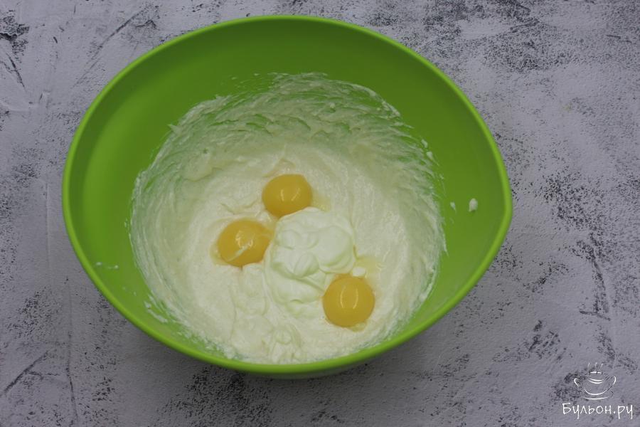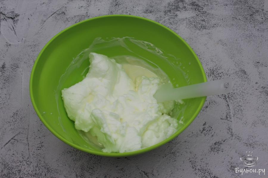 4. Отдельно, взбейте до крепких пиков яичные белки. Взбитые белки переложите в чашу с рикоттой и аккуратно перемешайте силиконовой лопаткой.