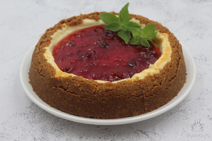 6. После чего дайте чизкейку полностью остыть, затем аккуратно извлеките его из формы, поставьте в холодильник для охлаждения минимум на 4 часа. Перед подачей, сверху на чизкейк, выложите малиновое варенье.