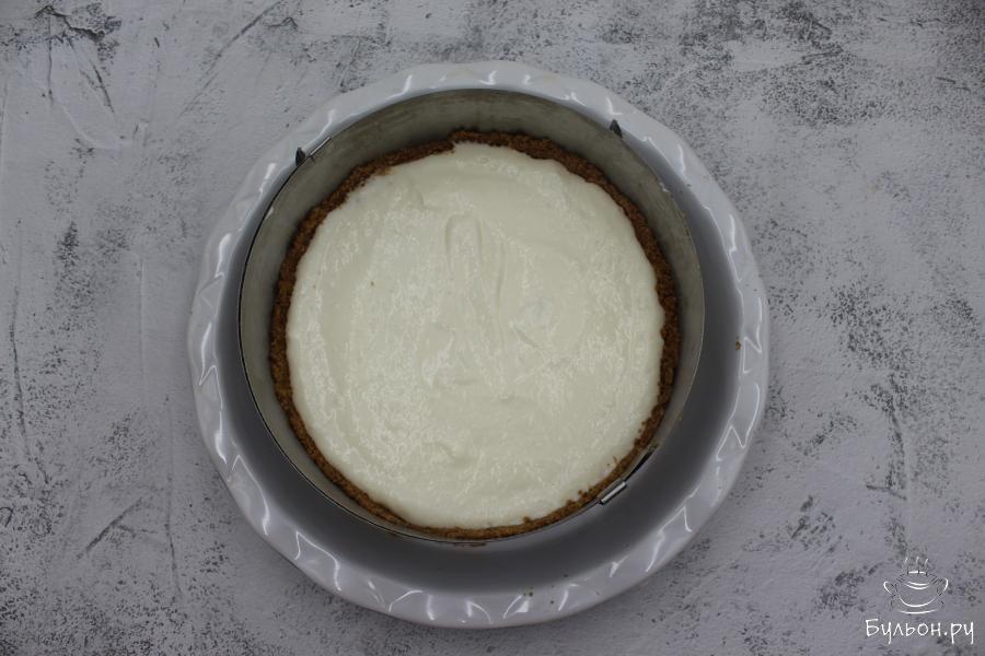 5. Перелейте начинку на песочную основу и поставьте выпекаться чизкейк в разогретую до 160 градусов духовку, на 50-55 минут.