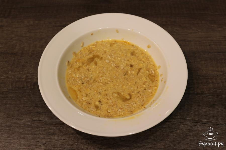 1. Нужно взять глубокую емкость и выложить в нее овсяные хлопья, молоко и яйца. Хлопья нужно использовать мелкого помола.