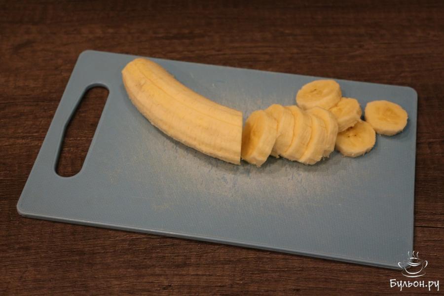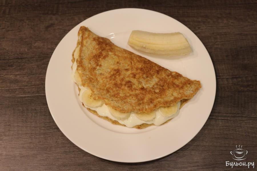 6. На тарелку положить готовый овсяноблин, одну его половинку смазать йогуртом, поверх выложить бананы. Аккуратно положить вторую половинку блина на начинку. При желании украсить сиропом или топленым шоколадом.