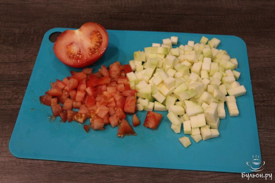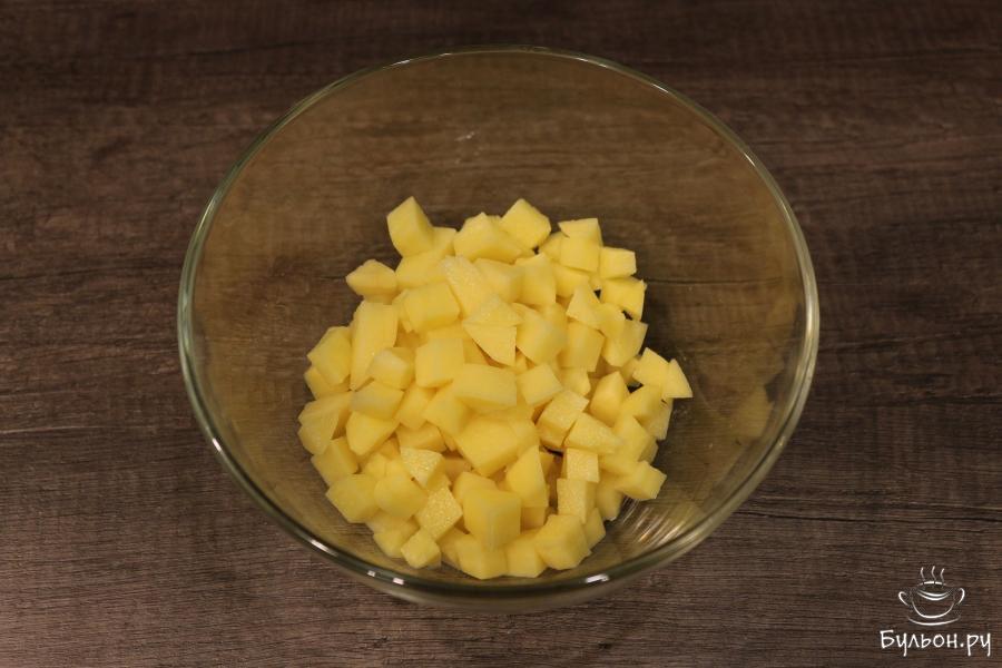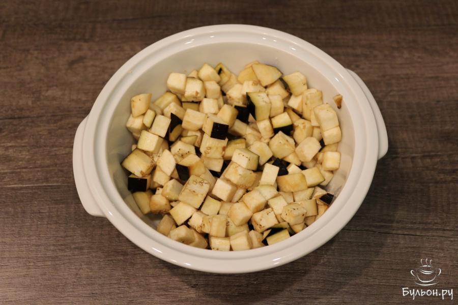 1. Баклажан нарежьте небольшими кубиками, выложите в емкость, посолите, перемешайте и оставьте на 20 минут.