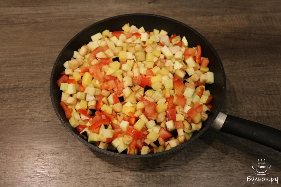 7. Затем положите все нарезанные овощи, посолите, тщательно все перемешайте, закройте крышку сковороды и тушите все в течении 1 часа, периодически помешивая овощи.