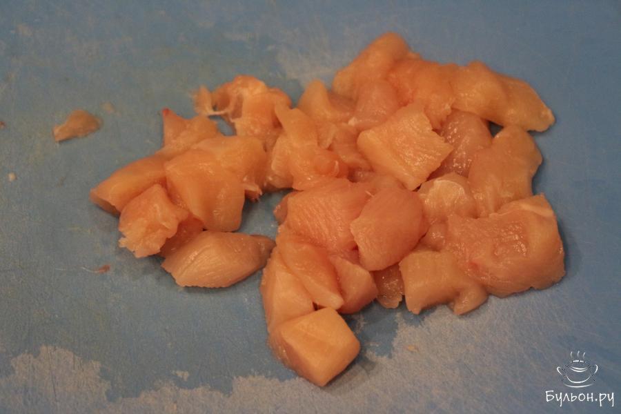 5. Куриное филе вымойте в холодной воде и нарежьте средними кубиками. В сковороду налейте растительное масло, выложите в нее кусочки курицы, слегка обжарьте, только до белого цвета, в конце посолите.