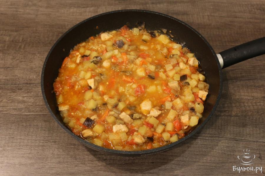 8. По истечению времени, добавьте в приготовленные овощи измельченный чеснок и перемешайте, протушите еще несколько минут. Тушеные овощи с куриным филе готовы.