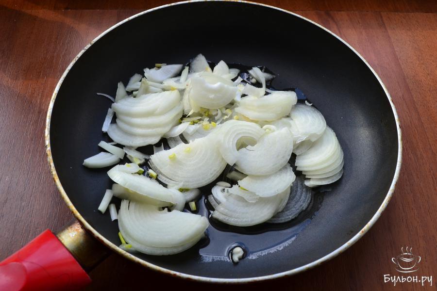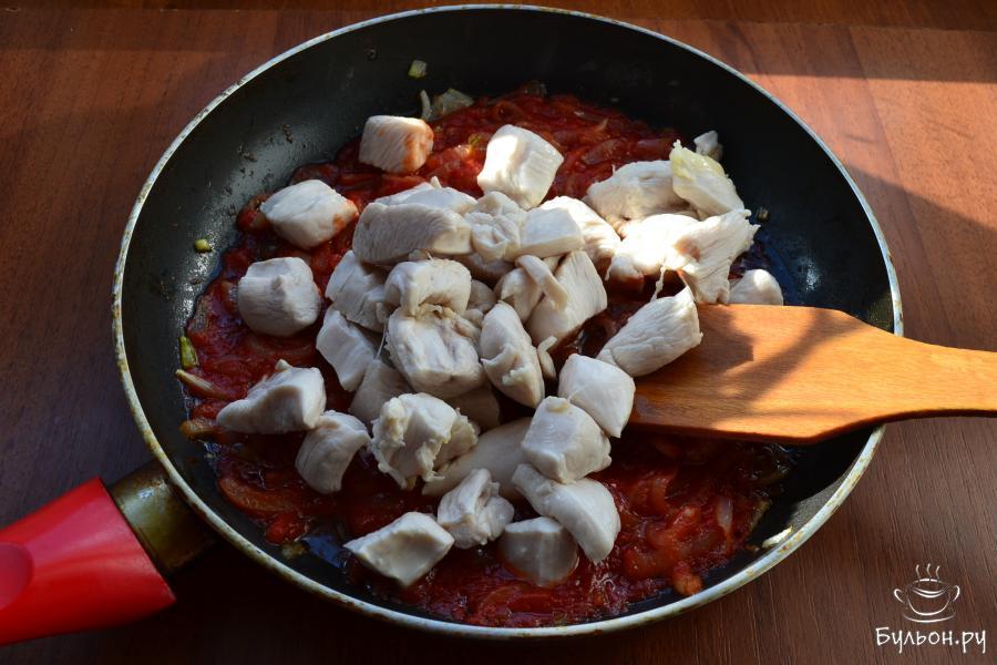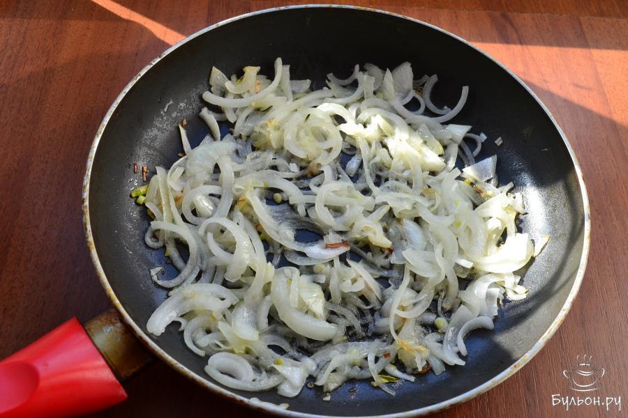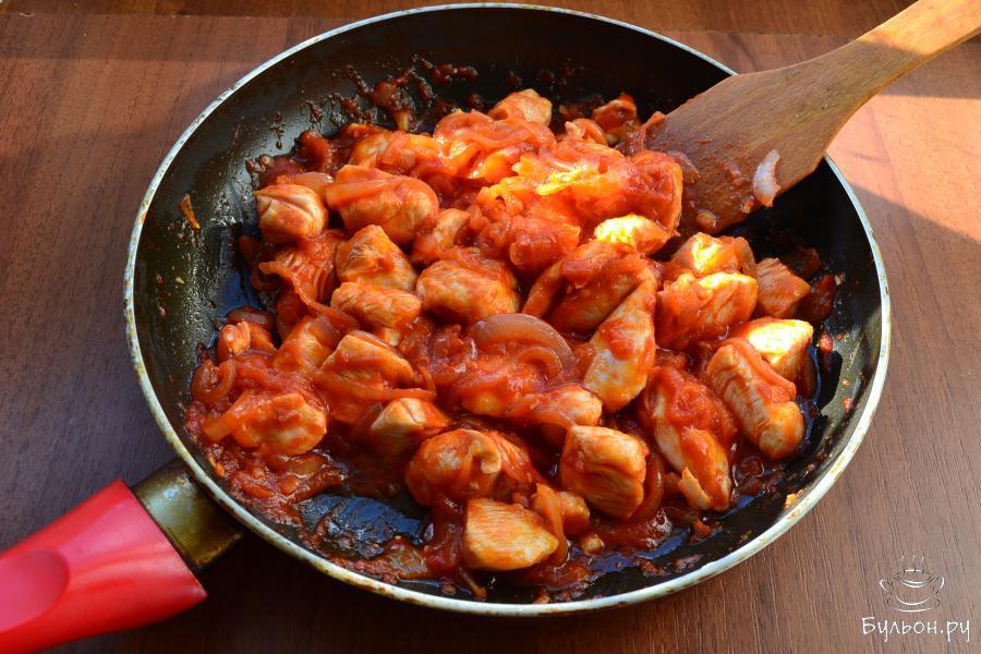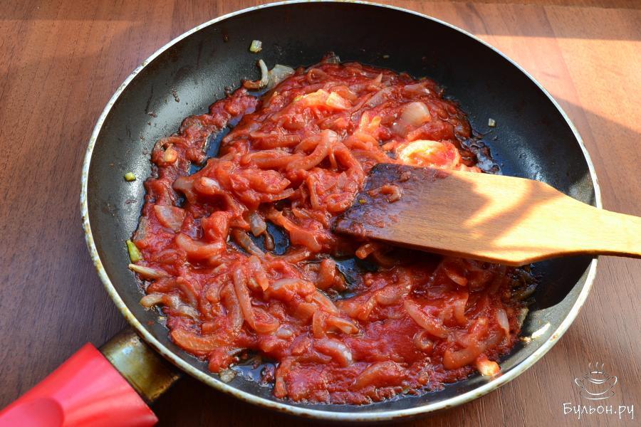 6. К луку добавить томатный соус или кетчуп, а также, жидкий дым, перемешать. Прокипятить соус 2-3 минуты, постоянно помешивая.