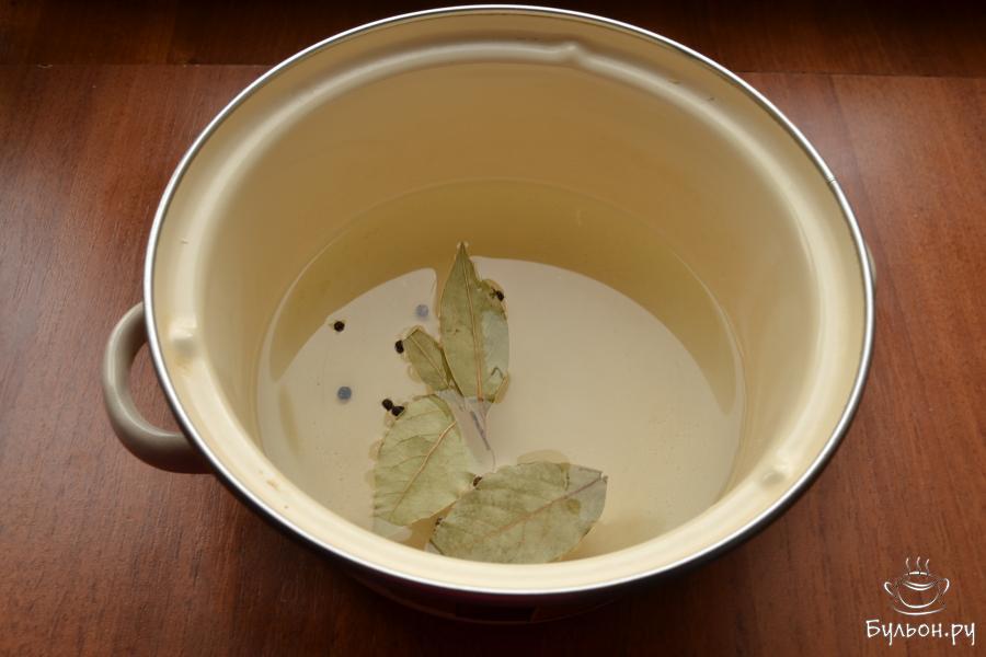 1. В кастрюльку с холодной водой добавить горошек, перец, лавровый лист, также, добавить сахарный песок и соль. Маринад закипятить, влить 9-процентный уксус.