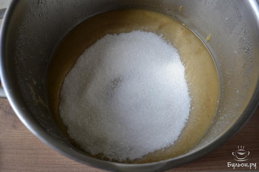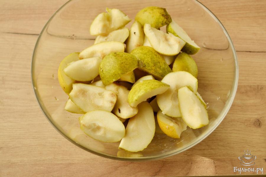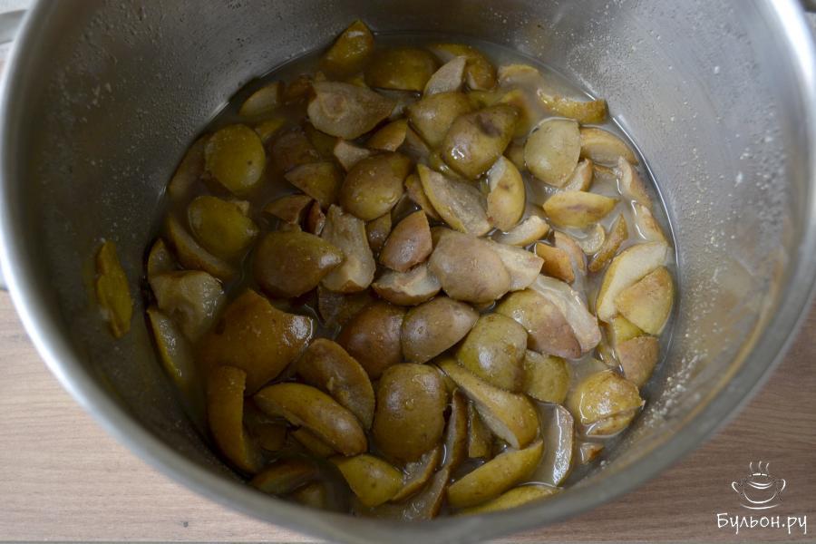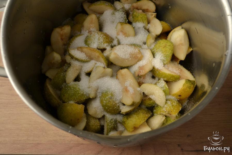 3. Положите нарезанные груши в кастрюлю с толстым дном и пересыпьте одним стаканом сахара, взяв его от общего количества. Оставьте груши при комнатной температуре на несколько часов, чтобы они дали сок.
