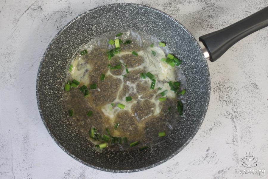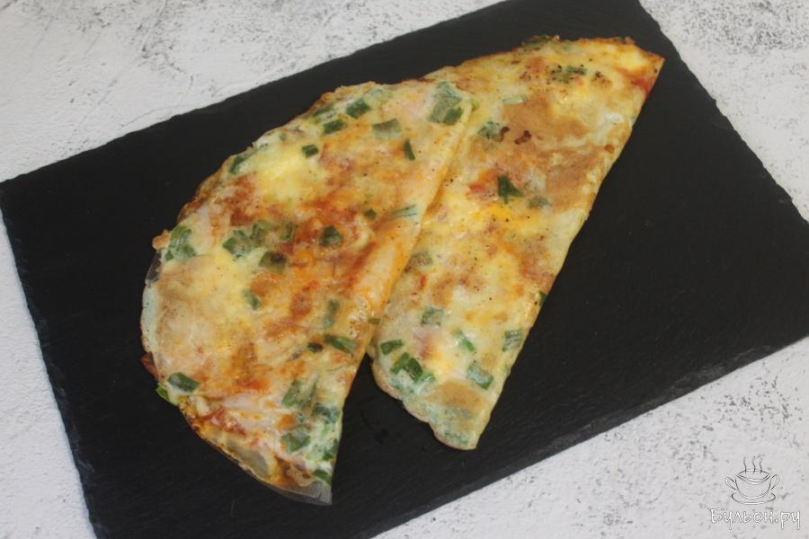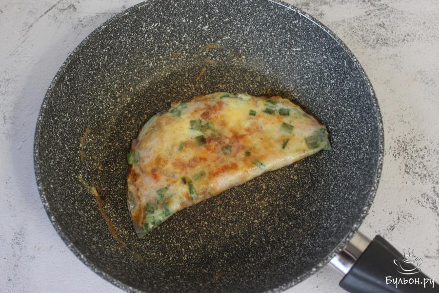 5. Сложите лист пополам и обжарьте лист с двух сторон, до образования хрустящей корочки. Точно также приготовьте вторую порцию омлета.