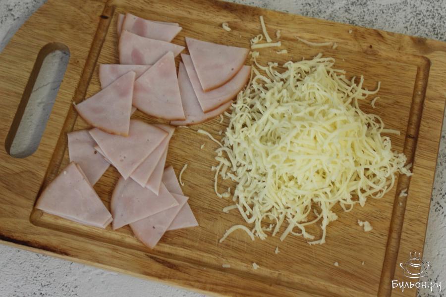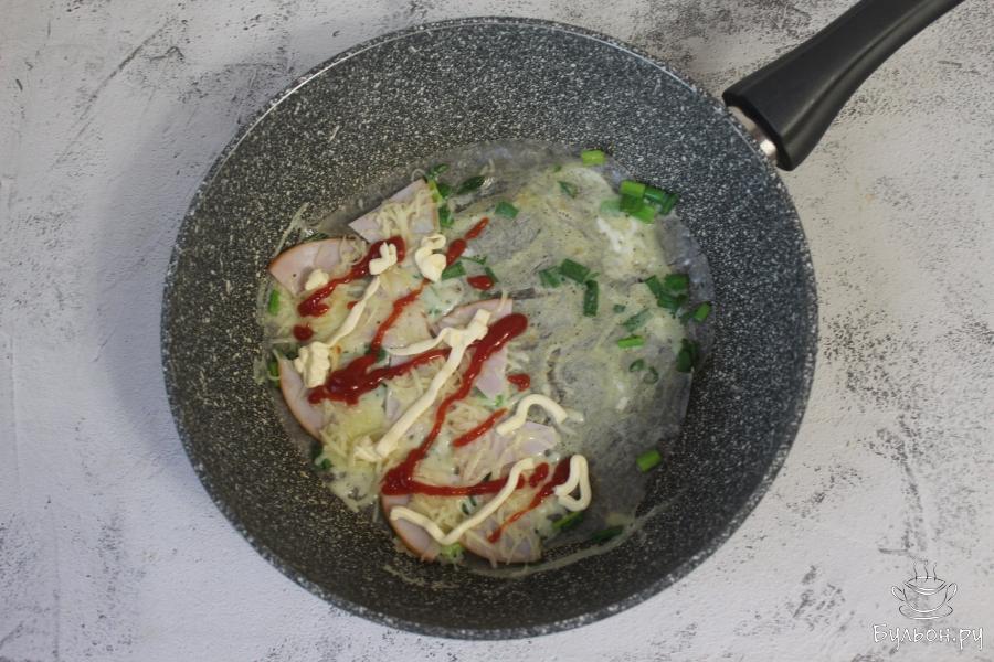 4. Когда яйцо начнет схватываться, на половину омлета выложите 1/2 часть ветчины, и столько же сыра, и слегка приправьте майонезом и кетчупом.