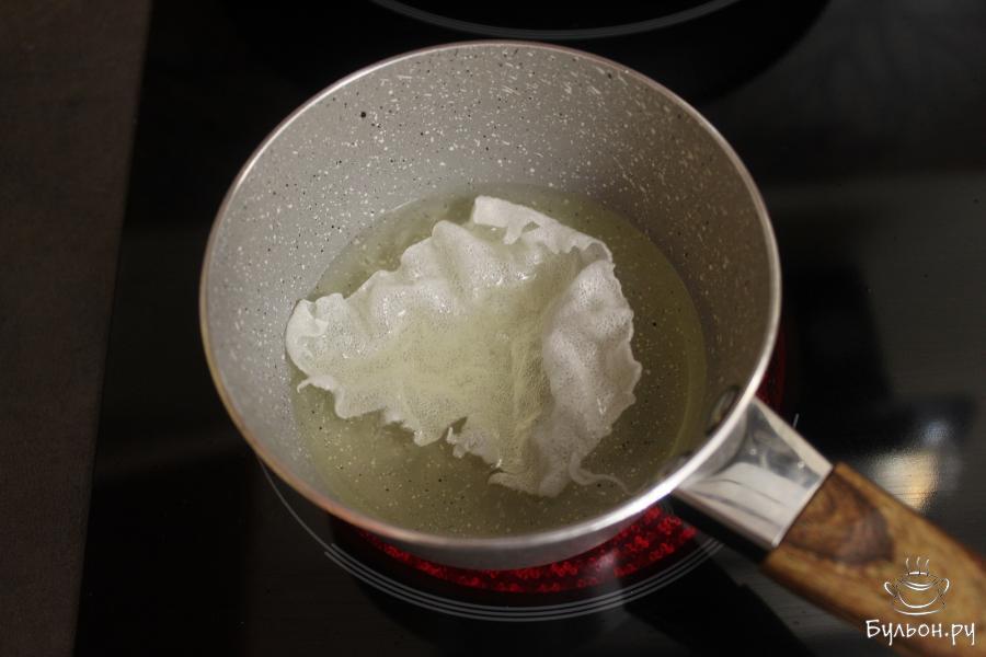 3. Выложите кусочек рисовой бумаги в разогретое масло и, как только он побелеет, сразу вытащите его. Ни в коем случае не пережаривайте чипсы, иначе они получатся слишком жесткими.