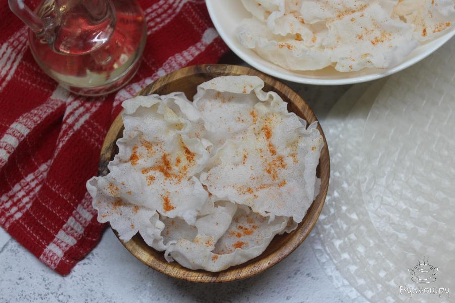 Это блюдо обязательно должно понравиться молодежи. Во-первых, молодые любят все самое вредное, а во-вторых, азиатская кухня, если выразиться по-молодежному, сейчас в тренде. Для приготовления чипсов из рисовой бумаги понадобится минимальное количество ингредиентов - это рисовая бумага, рафинированное масло и специи. В качестве специй можно использовать только соль или пакет специй из лапши быстрого приготовления.