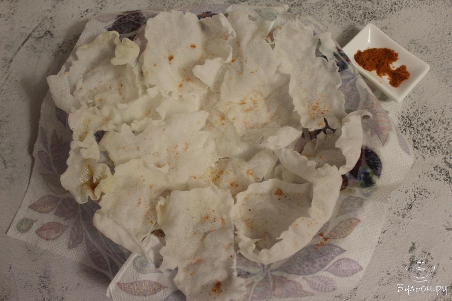 4. Обжаренные кусочки рисовой бумаги выкладывайте на тарелку, застеленную салфетками. Это позволит избавиться от лишнего масла.