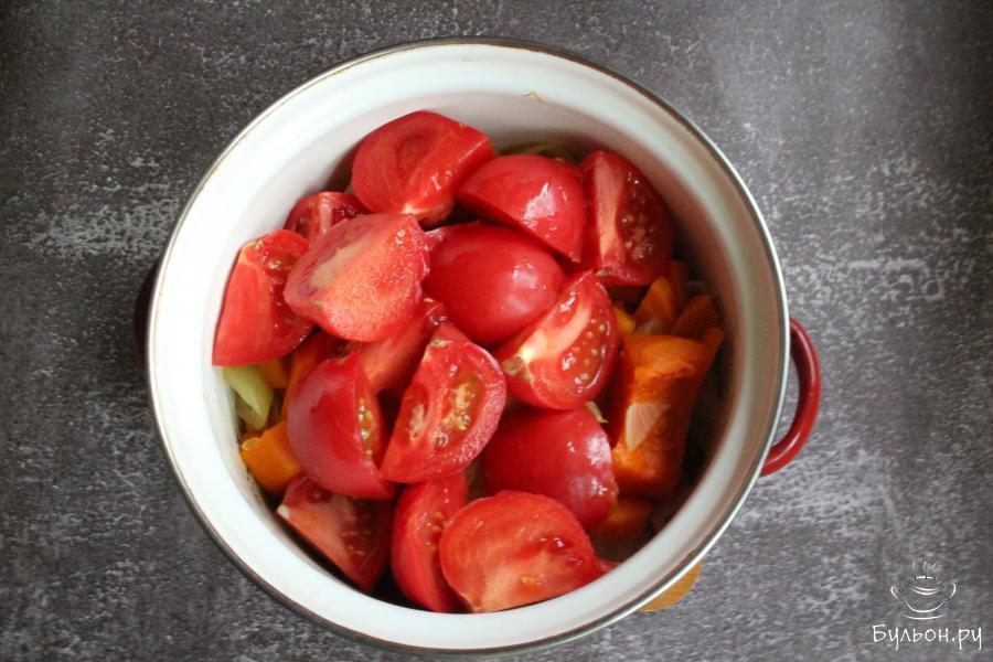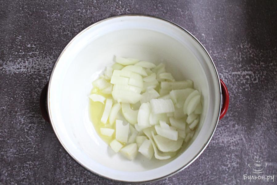 1. Лук, перцы, морковь и тыкву почистить. Овощи можно резать произвольно, не очень крупно. В кастрюльку налить масло и добавить нарезанный лук.