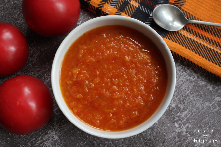 5. Овощи перекрутить через мясорубку или измельчить в блендере. Добавить соль и орегано по вкусу, перемешать и прогреть соус еще несколько минут.