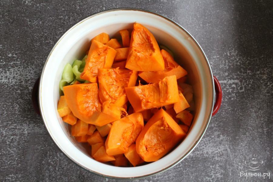 3. Тыкву нарезать крупно и добавить в кастрюльку. Влить воду и поставить посуду на огонь. Тушить овощи под крышкой 20 минут.