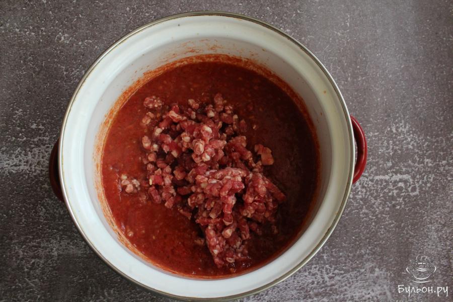 4. Выложить в кастрюльку фарш и добавить бульон. Тушить 15 минут, помешивать, чтобы фарш не был комком.